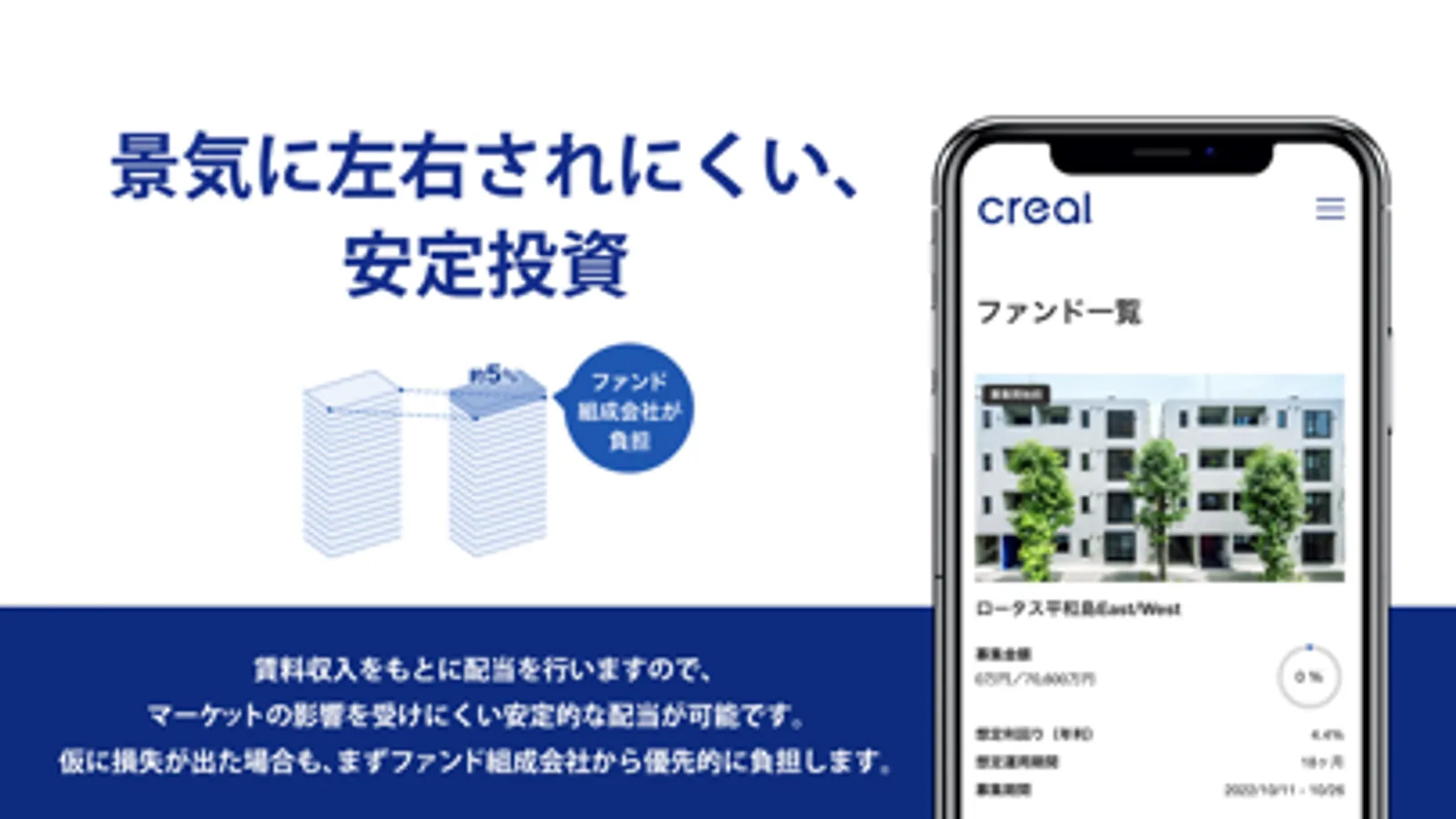 賃料収入をもとに配当を行いますので、マーケットの影響を受けにくい安定的な配当が可能です。損失が出た場合も、ファンド組成会社から優先的に負担します。