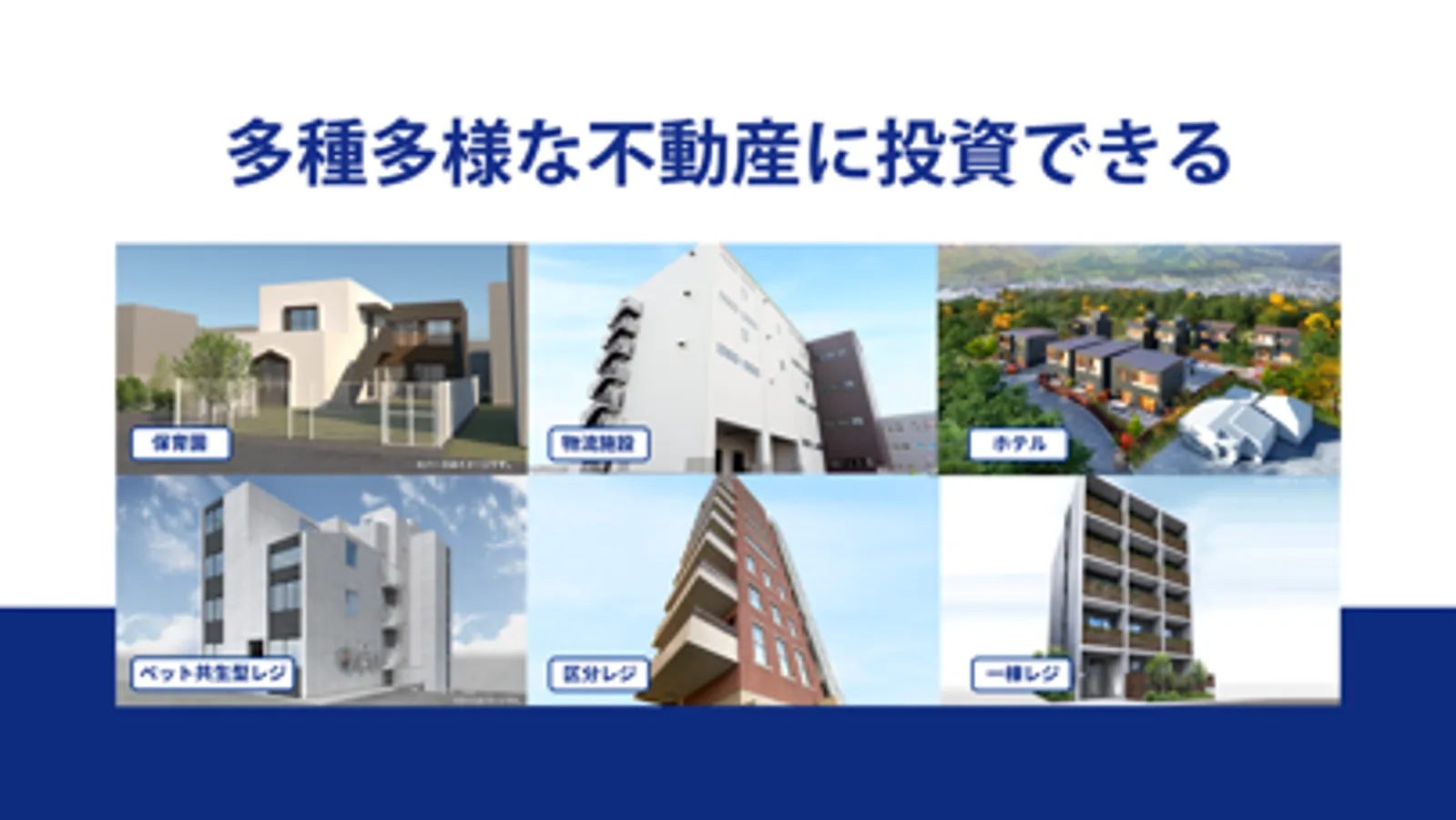 想定利回り4.0%~5.5%(年利) *1でマンション・保育園・物流倉庫・専門学校・オフィスなど様々な不動産に少額から投資可能です。