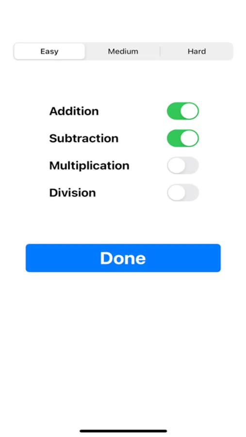 Choose between 3 different difficulty methods, Easy will contain 2 numbers up to 12 (Perfect for learning multiplication), Medium will contain 1 number up to 100 and 1 number up to 10, and hard will contain 2 numbers up to 100.