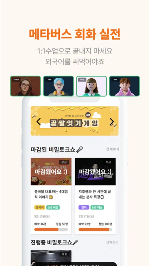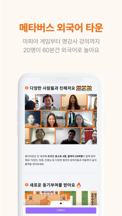 - 다양한 사람들과 메타버스에서 만나 60분간 영어/중국어로만 소통해요.
