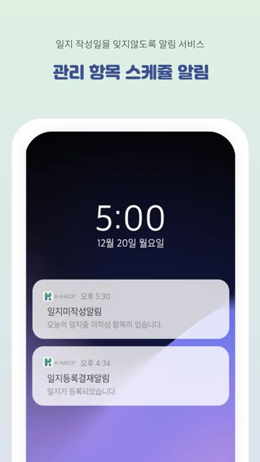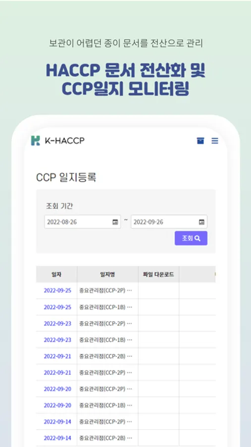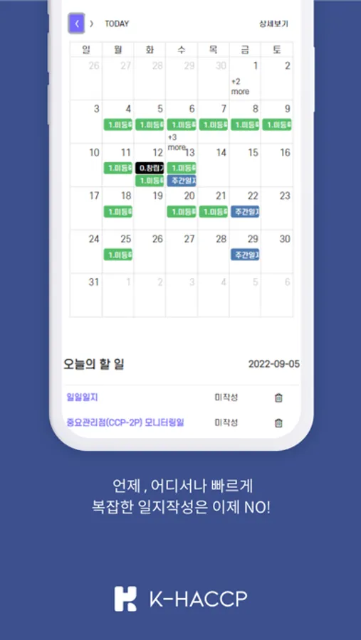 HACCP 관리를 위한 담당자 점검일지 작성, 스케줄 관리, 관리일지 결재 등을 제공합니다.