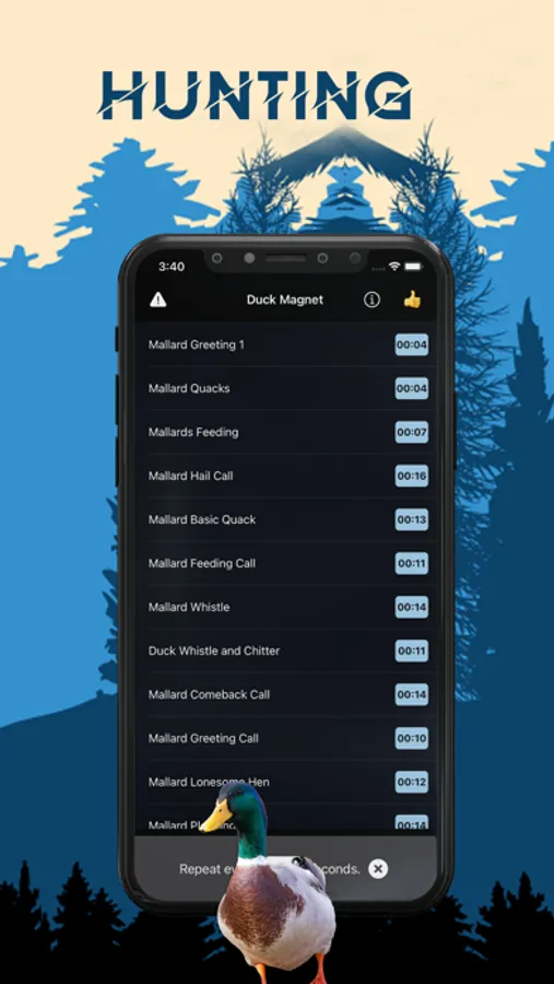 You can play the sounds individually and set them to repeat after the amount of seconds that you desire. Or you can manually tap different sounds create a deadly combination of calls that will work perfectly for goose hunting.
