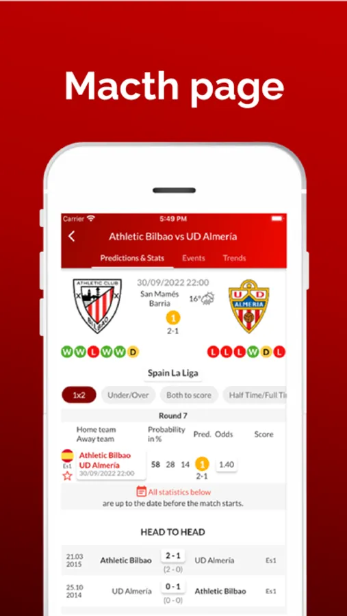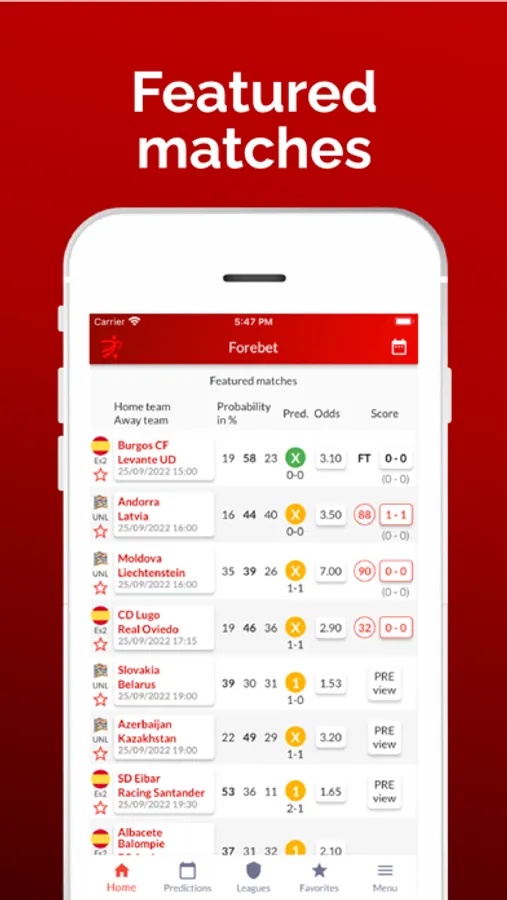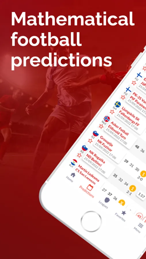 PREDICTIONS - A system for predicting football matches on the basis of statistics using complex mathematical algorithms. Probabilities are calculated for the final outcome of the match, goals scored, etc. The Forebet machine learning algorithms work on a huge database storing football data generated since year 2000. The results are then displayed in the app clearly in an easy to understand way.