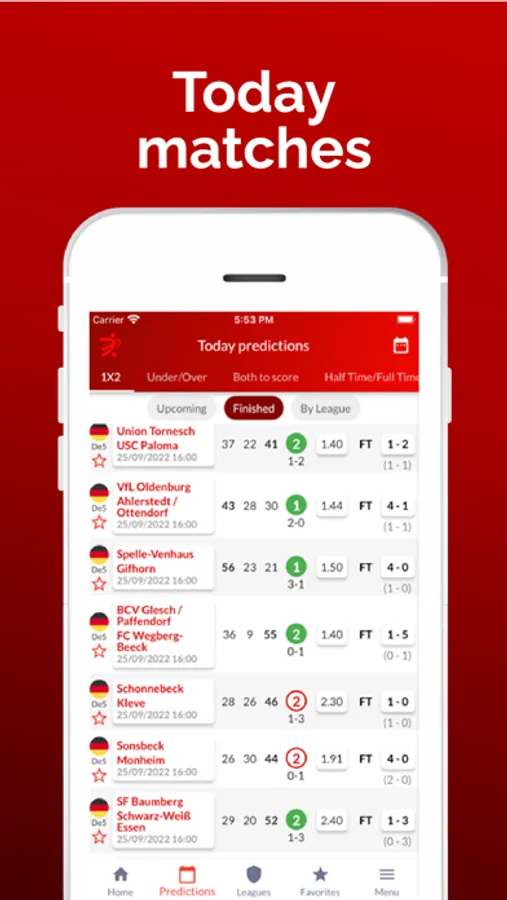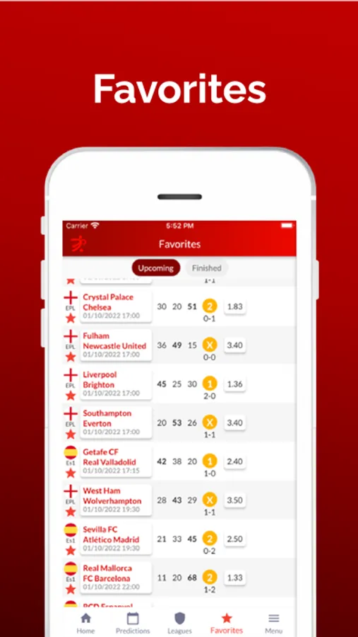 FAVOURITES - Follow the matches that matter to you simply by tapping on the star button next to each prediction row or just follow an entire league by selecting it from the leagues menu as a favourite again by the star button.