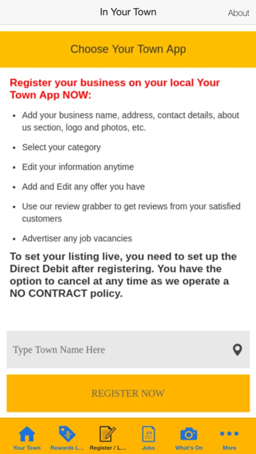 The In Your Town app is an app designed for businesses to advertise their services, products, jobs and offers locally and for you the user to find and take advantage.