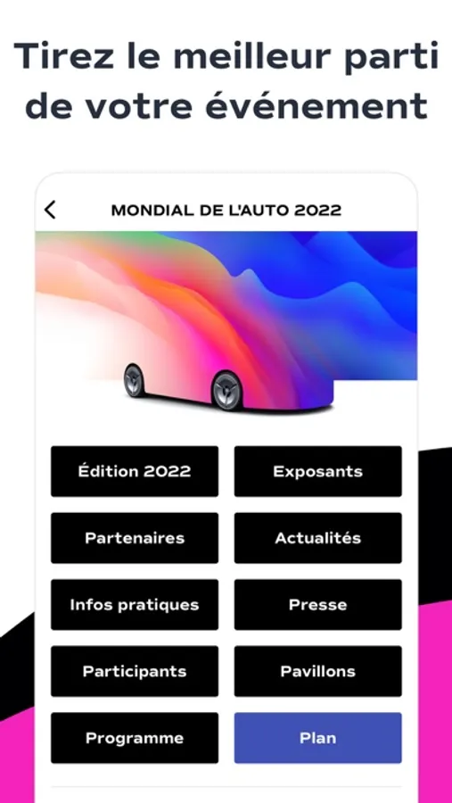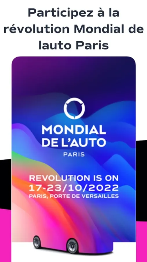 Grâce à l'application du Mondial de l'Auto, gardez à portée de main l'ensemble de la programmation du salon, tous vos exposants favoris, ainsi que les actualités en temps réel du 18 au 23 octobre.