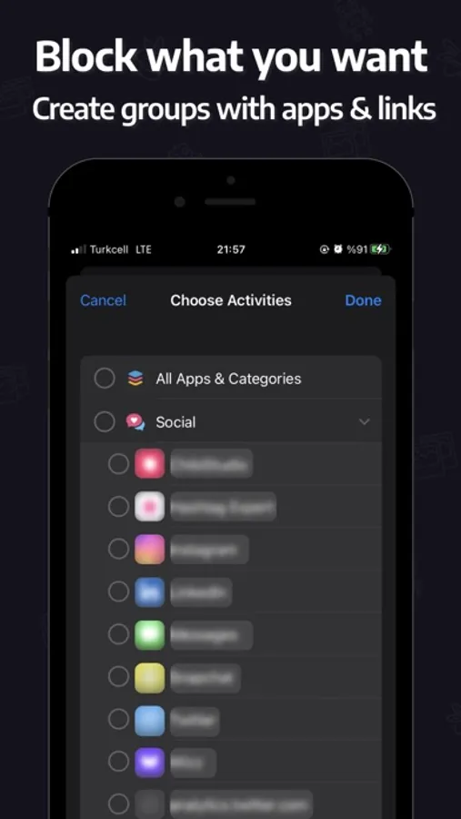 You can define days or hours when blocking is active using Modes. Would you like to block social media at work? Don't want work apps to disturb you at home. No issue. Create your Mode, select the apps you want to block and set the time frame. That is it!