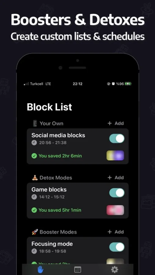 Do you scroll all day? Boosty will help you to avoid distractions. On your phone, you can disable apps with just a few touches. Apps that have been blocked cannot be opened, and their notifications will no longer annoy you.