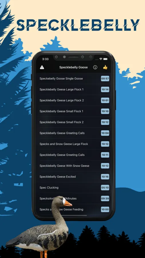 You can hear them in the distance but are unable to see them yet. A few minutes later you see a flock of specklebelly geese in the distance. You use this app to play the specklebelly goose sounds loud in hopes to get them to turn your direction.