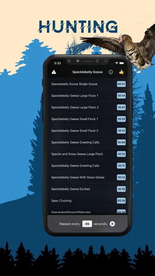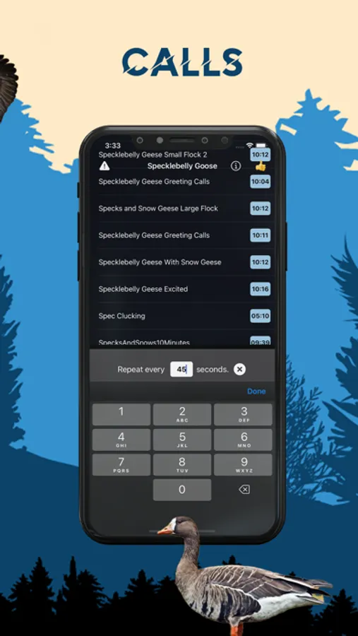 You can play the sounds individually and set them to repeat after the amount of seconds that you desire. Or you can manually tap different sounds create a deadly combination of calls that will work perfectly for specklebelly goose hunting.