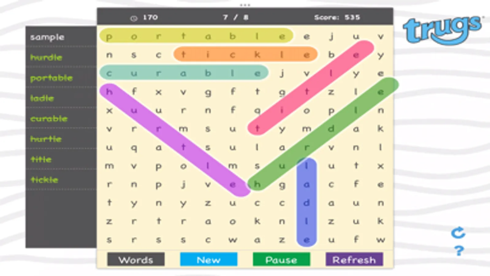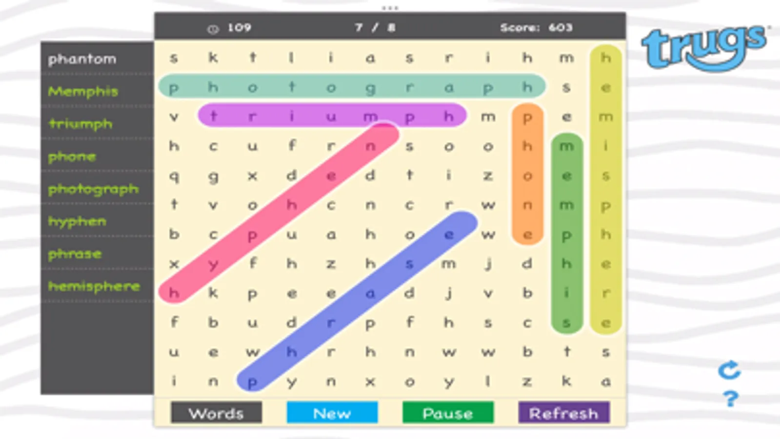 Trugs® is a structured phonics based English reading resource for school and home. Trugs Word Search 3 is a challenging structured word finder app to help read and identify words from the same Trugs phonics stage. This app is supplemental to the Trugs literacy card games and related activities, or can be used on its own.