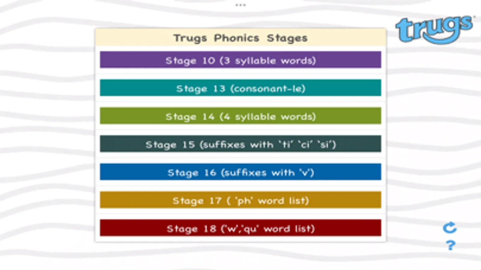 Trugs Word Search App 3 covers Trugs Stages 10,13,14,15,16,17 and 18, listed below in the chart. Trugs Word Search 1 and 2 are available and cover Trugs Stages early and mid stages.