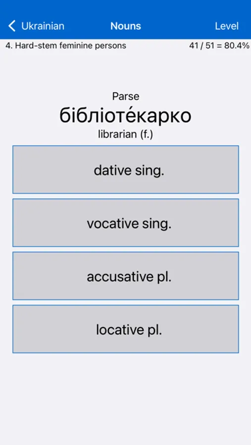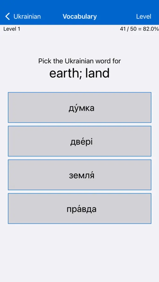 • Vocabulary: 151 levels, each testing the meanings of ten Ukrainian words. Interspersed among these are cumulative levels reviewing what has been learned earlier (giving a total of 171 levels).