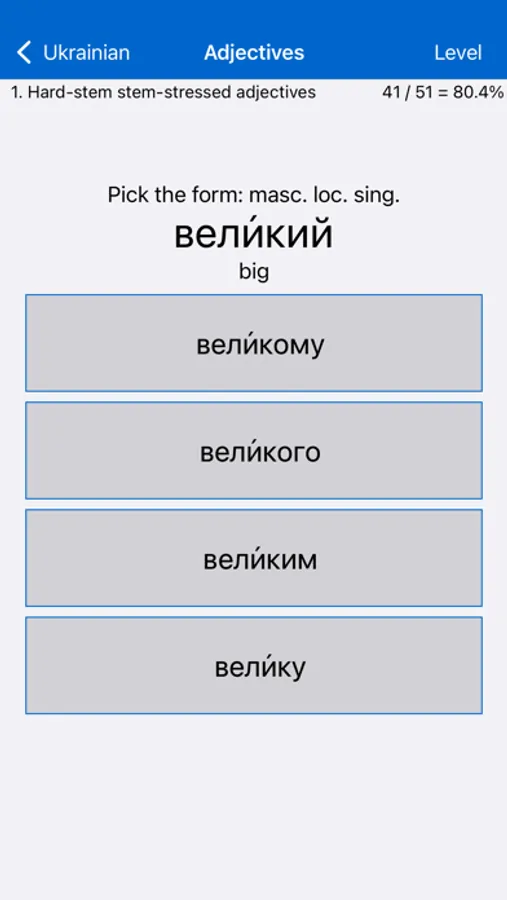 • Adjectives: Tests your ability to recognise and decline Ukrainian adjectives.