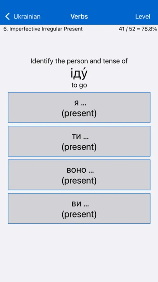 • Verbs: Tests your ability to parse and to conjugate a range of representative Ukrainian verbs.