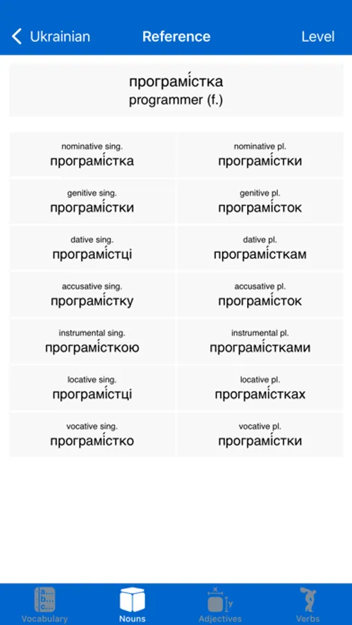 • Nouns: Tests your ability to parse and to decline a wide range of Ukrainian nouns.
