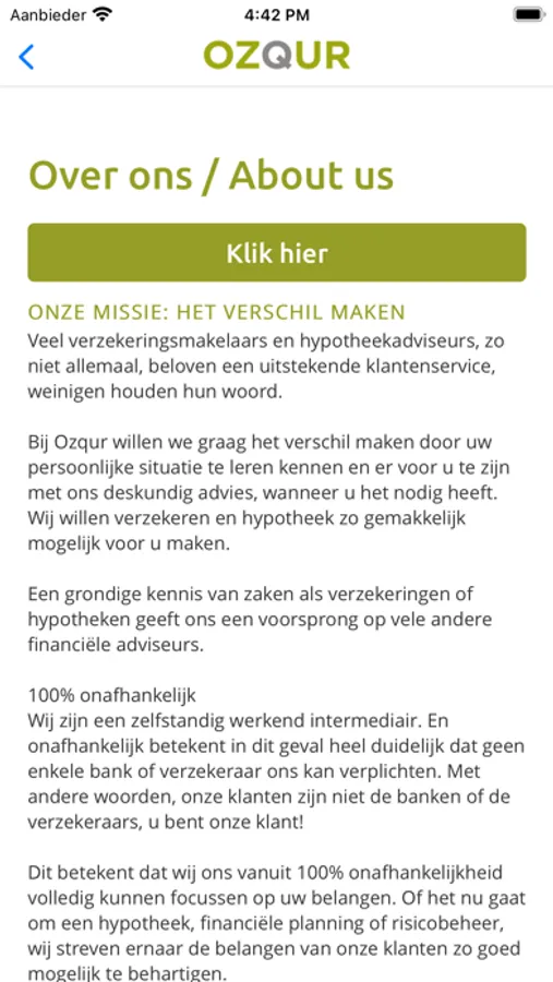 We zeiden het al: wij zijn financieel adviseurs. Ons vak is dan ook adviseren en begeleiden op het zeer brede terrein van de financiële dienstverlening. Dat betekent dat we ons specialisten durven te noemen op de gebieden van hypotheken en verzekeringen. Met behulp van onze app komt u gemakkelijk in contact met onze adviseurs. Daarnaast houdt u ook uw documentatie gemakkelijk bij en stuurt u stukken toe zodat wij u nog beter van dienst kunnen zijn.
