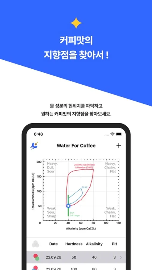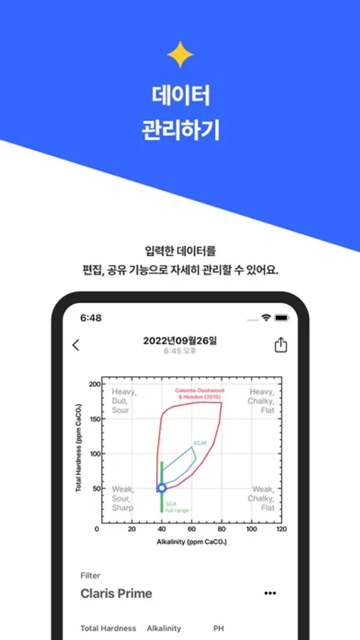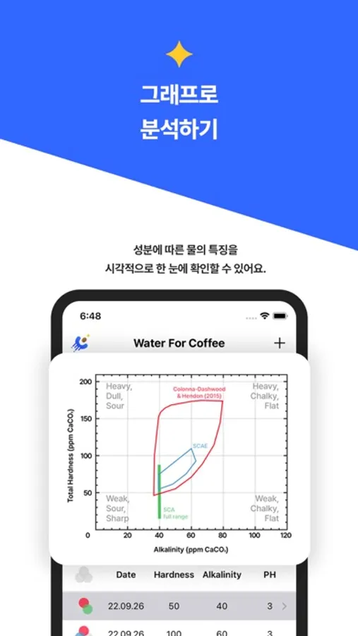 - 입력한 데이터가 SCA, SCAE, Colona Dashwood & Hendon이 제시한 적합한 기준에 부합하는지를 분석하여 맛의 지향점을 시각적으로 보여주도록 하였습니다.