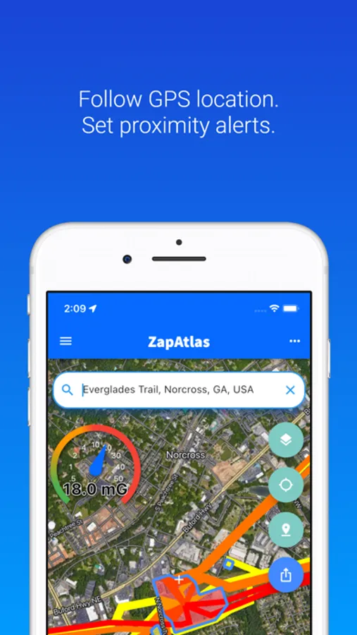 In GPS mode, ZapAtlas™ can follow the user’s location and generate a vibrating “Zap Alert” when a high EMF measurement is detected.