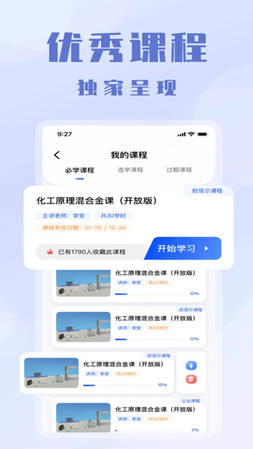 【课程类型】支持观看并可自主选择化工化学,制药,食品工程,生物工程等多个专业的相关课程,并配有相应题库和错题本,学习记录数据化展示,能清楚地展现当前学习情况