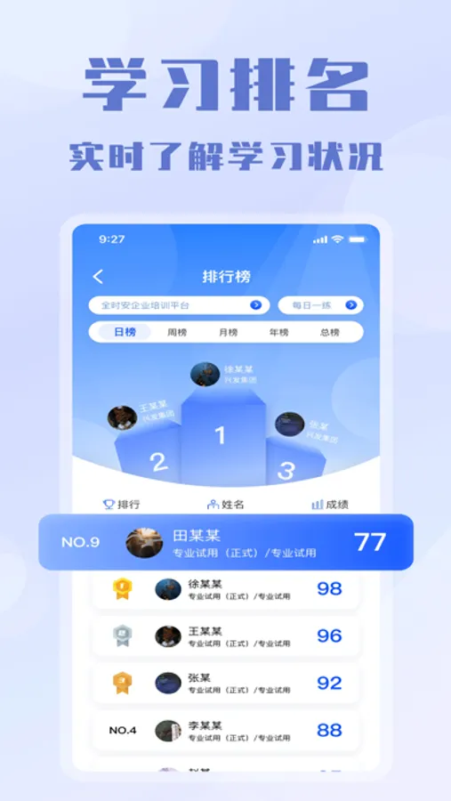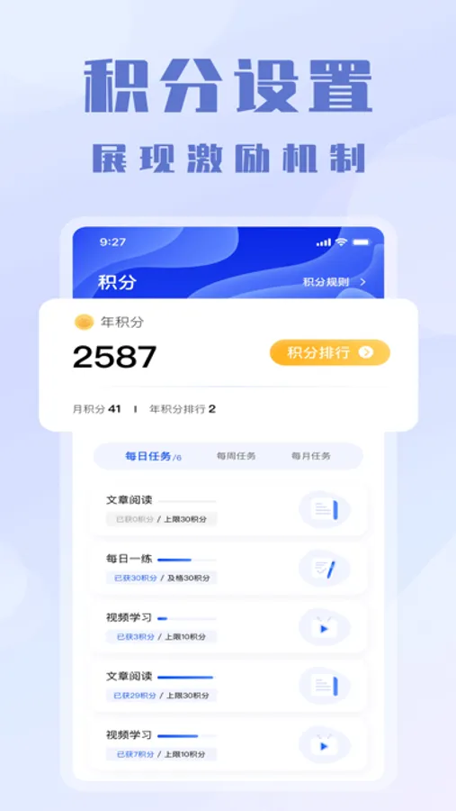 3.学习没有动力?欧智安设置积分排行榜,能清楚查看自己所获积分及所在排名;只需要通过相关学习和题库练习即可获得相应积分,解决学习枯燥的问题。