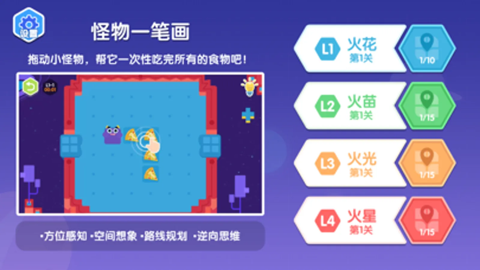 怪物一笔画-火星思维,旨在通过有趣的、适宜的科学思维训练活动,帮助儿童不断提升空间想象能力、学习能力,为将来的生活、学习提供优质的能力保障。