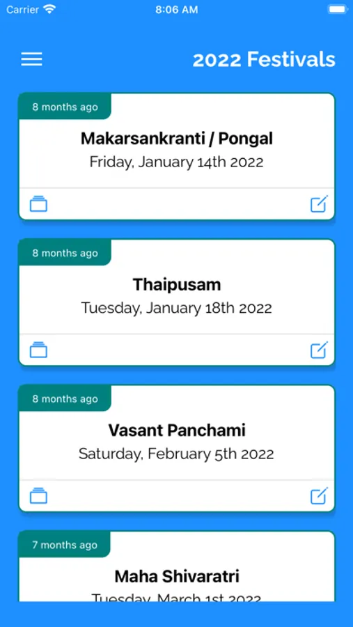 This handy app allows users to track the hindu festivals. Users can capture journal of events during these festivals. These jounals can be any eventful moments, todo items, planning related tasks etc.