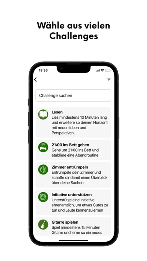Habit-Tracker: Starte und absolviere Herausforderungen (Challenges), um Punkte zu sammeln und inspirierende Trophäen freizuschalten. Die Challenges umfassen vor allem die Bereiche Sport, Gesundheit, Ernährung und persönliche Entwicklung, helfen aber auch schlechten Angewohnheiten, wie zum Beispiel übermäßigen Social Media Konsum (Dopamin Detox), den Kampf anzusagen.