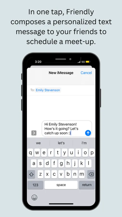 1. Friendly automatically composes a personalized text message to your friends to schedule a meet-up for you in one tap. This makes it easier for you to catch up with friends you have not interacted with recently.