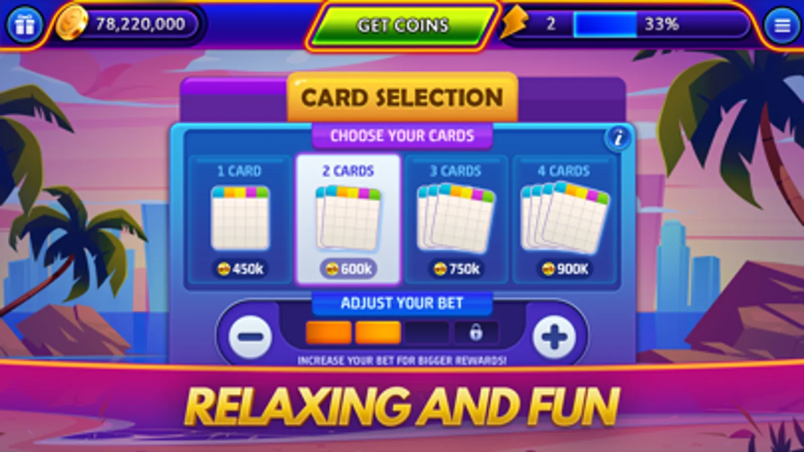 The more bingos you get in this game, the more entertaining it becomes. Whether you're looking for something to fill those moments of downtime or want a fun new game to try out while waiting in line at the grocery store, taking a break at work, or lounging at home on a rainy day, Vegas Bingo has everything that you need.