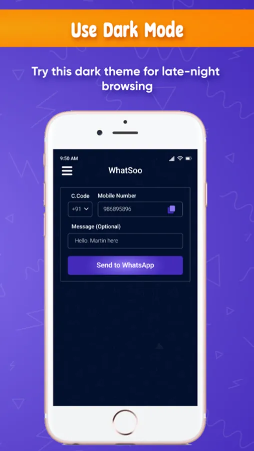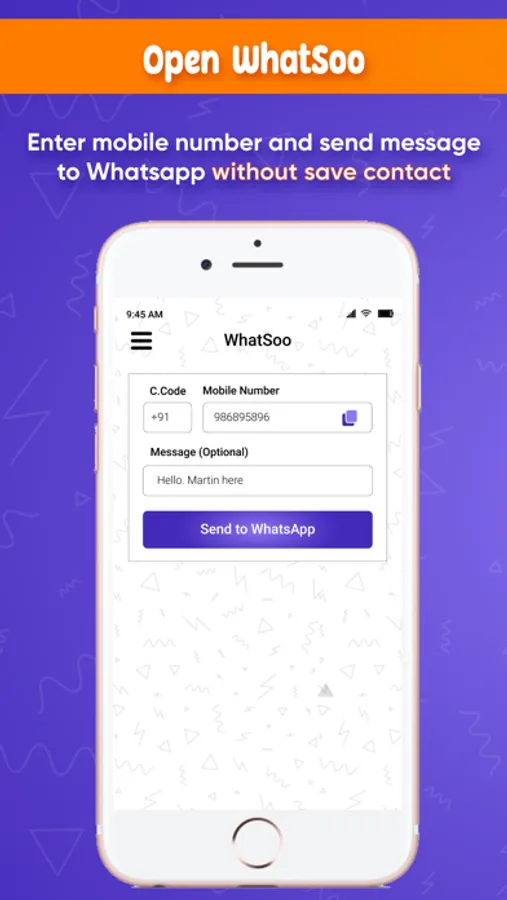 WhatSoo App is a supportive app for WhatsApp messenger. When you want to WhatsApp message on new contact number which is not added in mobile contact directory or don't want to add in contact directory at that time use this app, just write contact number and message, WhatSoo App will start chat on given contact number in WhatsApp, no need to save contact number.