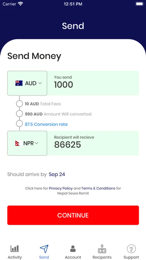 Add the amount you want to send and recipient’s details. Check the transaction fees upfront, and the estimated time your money will be delivered.