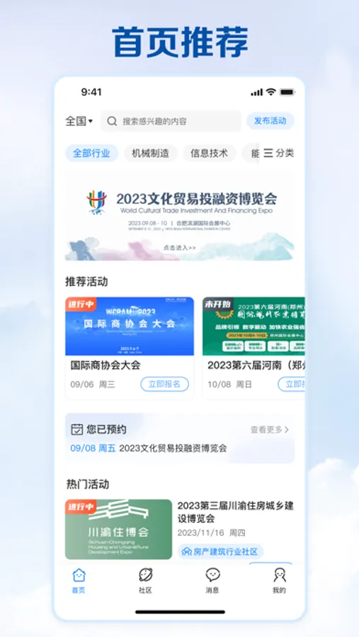 支持发布多种类型商务活动,会议、展览、节庆、赛事一应俱全。活动资讯、精选热门活动提醒,实现活动资讯共享、云端展示、线上直播,助力活动报名及数据管理。