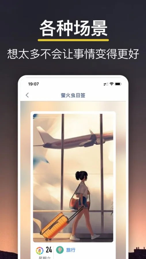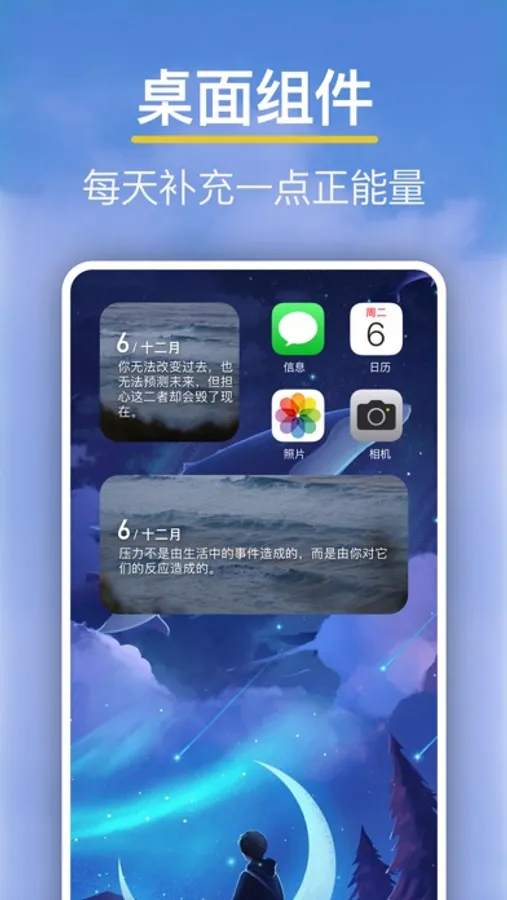 萤火虫还提供桌面小组件,用它来打造你日常想法的积极性!每段文字都有配图,可以与朋友分享一起鼓劲儿,或将文字图片制作成日签壁纸分享到社交媒体。