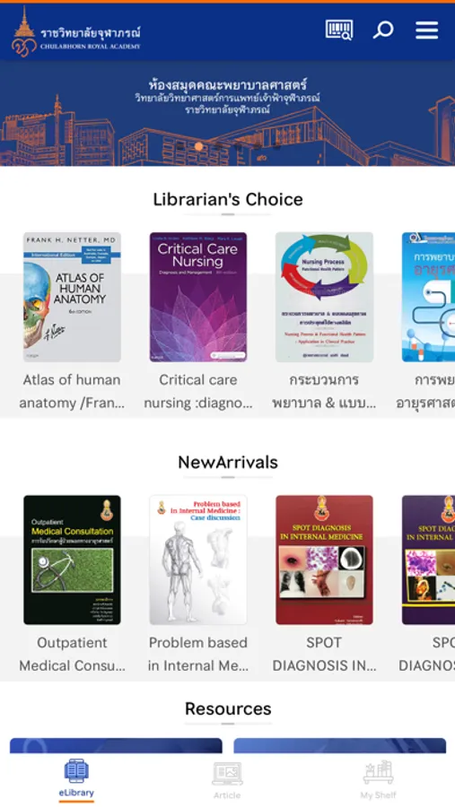 แอปพลิเคชันห้องสมุดคณะพยาบาลศาสตร์ วิทยาลัยวิทยาศาสตร์การแพทย์เจ้าฟ้าจุฬาภรณ์ ราชวิทยาลัยจุฬาภรณ์ (CRA Nursing E-Library) มีทรัพยากรและบทความ ให้ผู้ใช้ได้เลือกยืมอ่านมากมาย ในรูปแบบของ E-Book ซึ่งสามารถเปิดอ่านหน้าหนังสือได้เสมือนกับการอ่านหนังสือจริง และมีฟีเจอร์ที่ช่วยอำนวยความสะดวกแก่ผู้ใช้