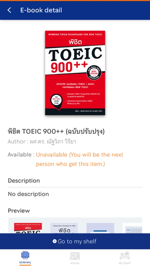 มีหมวดหมู่ทรัพยากรได้แก่ หนังสือ แมกกาซีน ซีดี/ดีวีดี อีบุ๊ค อีแมกกาซีน หนังสือเสียง มัลติมีเดีย ดิจิทัลไฟล์ ทรัพยากรออนไลน์และบทความ ให้ผู้ใช้ได้เลือกยืมอ่านมากมาย ในรูปแบบของ E-Book ซึ่งสามารถเปิดอ่านหน้าหนังสือได้เสมือนกับการอ่านหนังสือจริง และมีฟีเจอร์ที่ช่วยอำนวยความสะดวกแก่ผู้ใช้ไม่ว่าจะเป็นการเพิ่มบุ๊คมาร์กหนังสือ การเปิดหน้าหนังสืออัตโนมัติตามเวลาที่ตั้งไว้ และการเพิ่มโน้ตสั้นไว้จด บันทึกข้อมูลขณะอ่าน