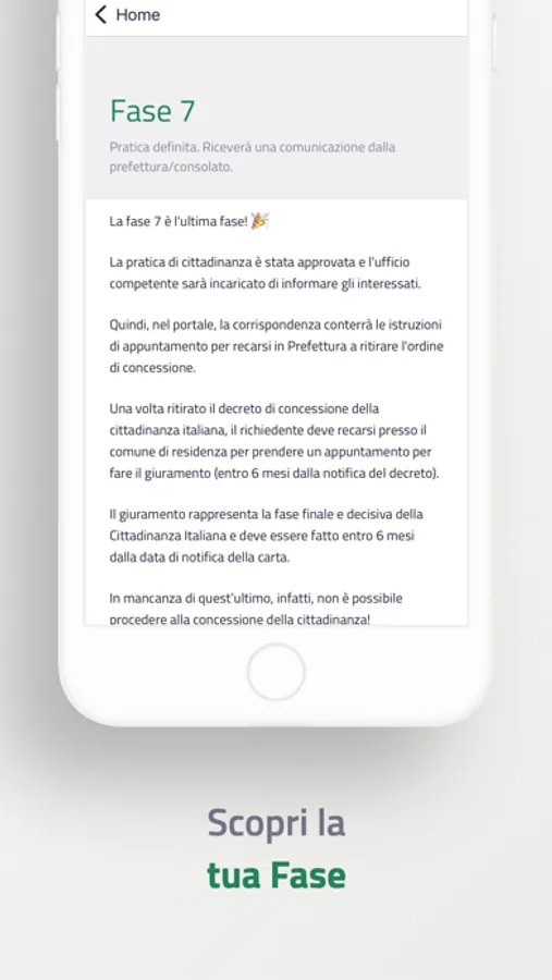 Si nota anche che l'app CheFase non sostituisce l'app IO per ricevere gli aggiornamenti della pratica di Cittadinanza Italiana. Infatti ti consigliamo di usare l'app IO per ricevere gli aggiornamenti in tempo reale.