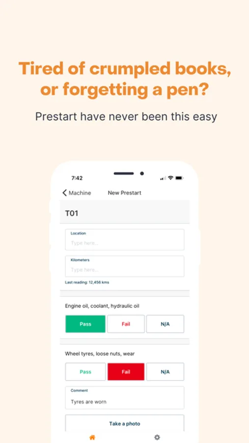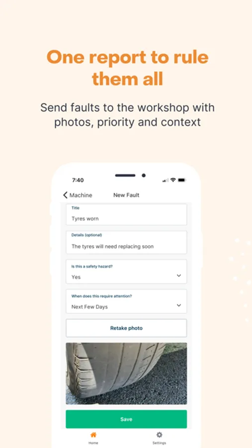 Begin by selecting a machine from the homepage, or scanning a QR code. You’ll be able to see all outstanding faults for the machine, begin a new prestart, or report a new fault. If any issues need reporting, take a photo and add a description before submitting.
