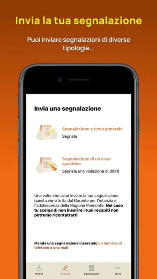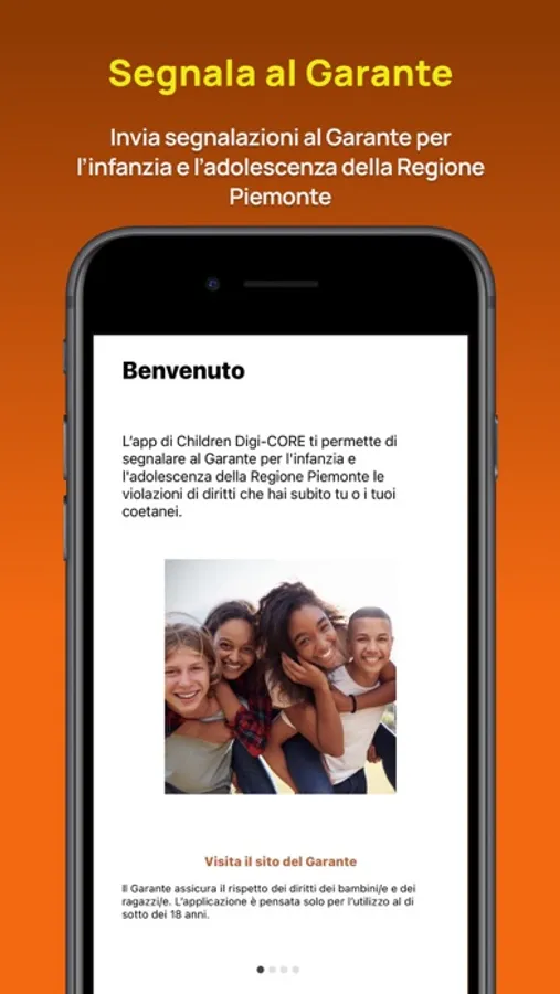 A mobile app for children to be more aware of their rights, to understand when to turn to their help to help them support children and adolescents in the Piedmont Region. The application, by sending a report, allows children to contact the Ombudsperson for Children the Piedmont Region from their mobile phone, even anonymously, supporting them in identifying useful information for reporting.
