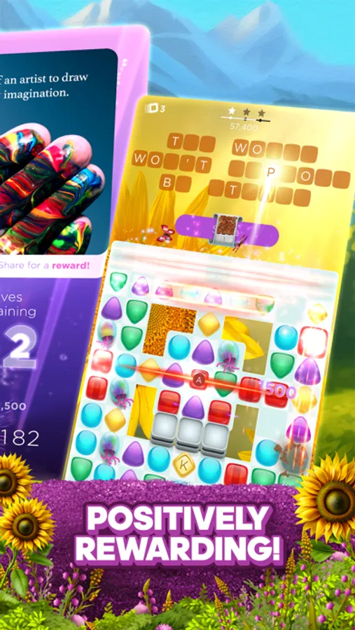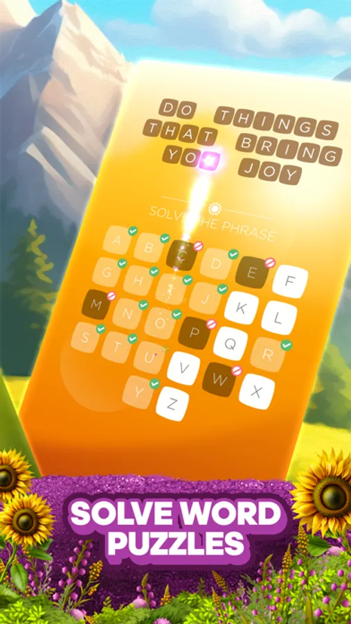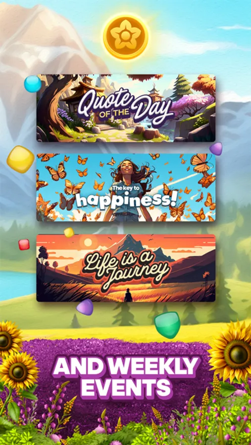 Match 3 colors to collect letter tiles, break through obstacles, and solve the phrase to find inspiration from motivational quotes and positive affirmations. Earn rewards and boosters, progress through chapters of puzzles, and win limited-time events.