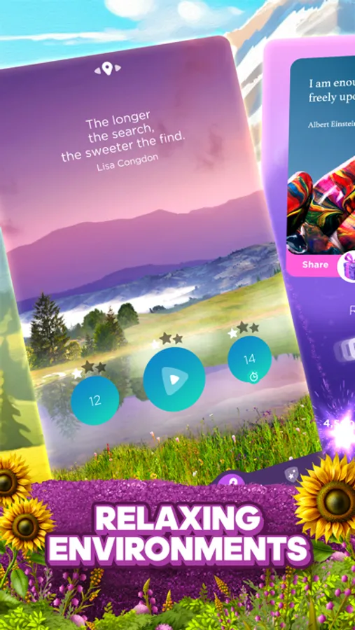 Easy to play but tough to master! Triumph over hundreds of fun match 3 puzzle games set in calming, nature-inspired levels. Earn rewards and achievements with weekly events centered around messages of inner strength, self-reflection, mindfulness, self-care, personal well-being, and life adventures. Put your strategy skills to the test to match, swap, and collect letter tiles. Make matches of three in a row or more to clear colors, remove blocks, and form words. Solve the phrase to reveal celebrity quotes, win games, reach milestones, and move on to the next level of your journey.
