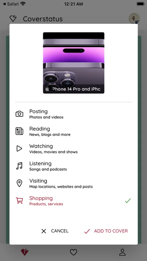 3. On Coverstatus app select the appropriate category and tap "Add to Cover".