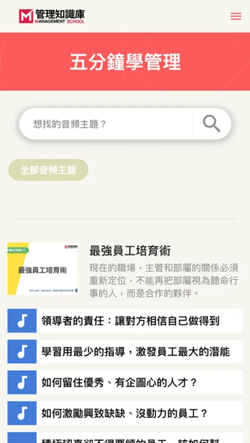 ● 五分鐘學管理:每月精選4個核心職能主題,20支短音檔讓零碎時間也能學管理