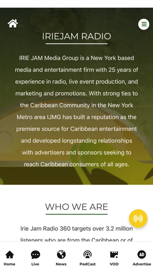 Irie jam media group is a new york based media and entertainment firm with 25 years of experience in radio, live event production, and marketing and promotions. With strong ties to the Caribbean community in the new york metro area ijmg has built a reputation as the premiere source for Caribbean entertainment and developed longstanding relationships with advertisers and sponsors seeking to reach Caribbean consumers of all ages.