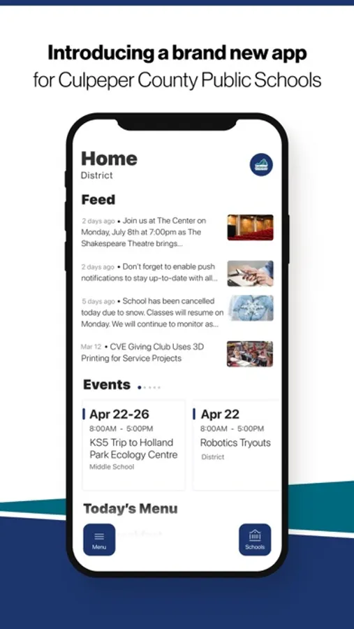 The event section shows a list of events throughout the district. Users can add an event to their calendar to share the event with friends and family with one tap.