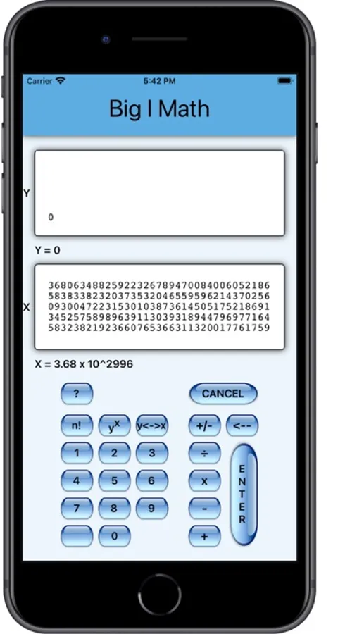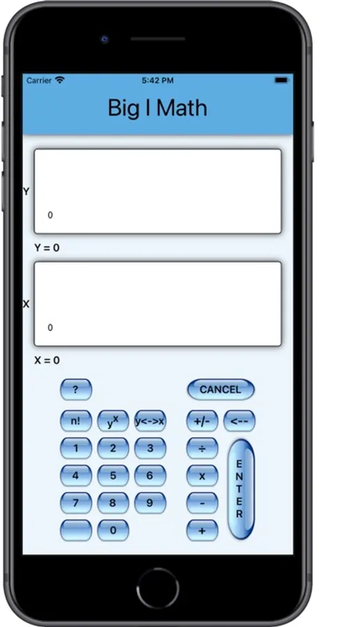 It is an RPN calculator where numbers are entered and pushed onto a stack. Operations are performed, removing numbers from the stack. The built in operations include addition, subtraction, multiplication, division as well as exponential and factorial functions.