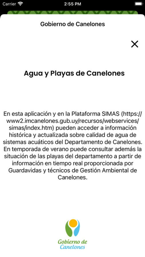 Esta Plataforma, tanto en su versión Web como en la aplicación, nos permite conocer la calidad de los Sistemas Acuáticos de Canelones así como el estado, el equipamiento y los servicios de nuestras playas, reafirmando una Política Ambiental que busca articular niveles crecientes de eficacia y eficiencia en los servicios, con una fuerte agenda ambiental que incorpora los desafíos de este nuevo siglo.