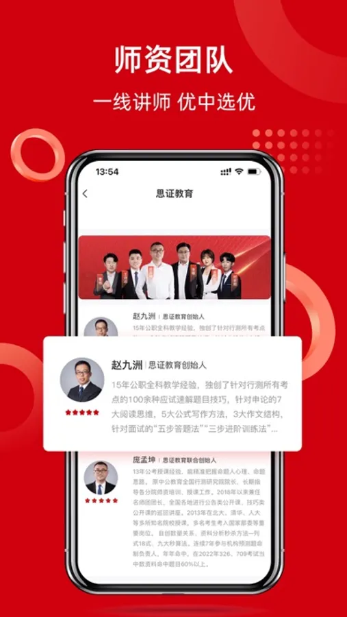 思证教育app是北京途为思证科技有限公司倾心打造的在线教育服务平台,师资力量雄厚,教育资源优渥,师资平均从业经验9年以上,均曾为行业头部机构的教学教研带头人,专业功底扎实,教学经验丰富,考情、学情把握精准,培训通过率遥遥领先。思证教育拥有国内顶尖的教学服务及课程体验团队,致力于将优质的面授式传统教育互联网化,让更多用户体验在线课程的智能与便捷。