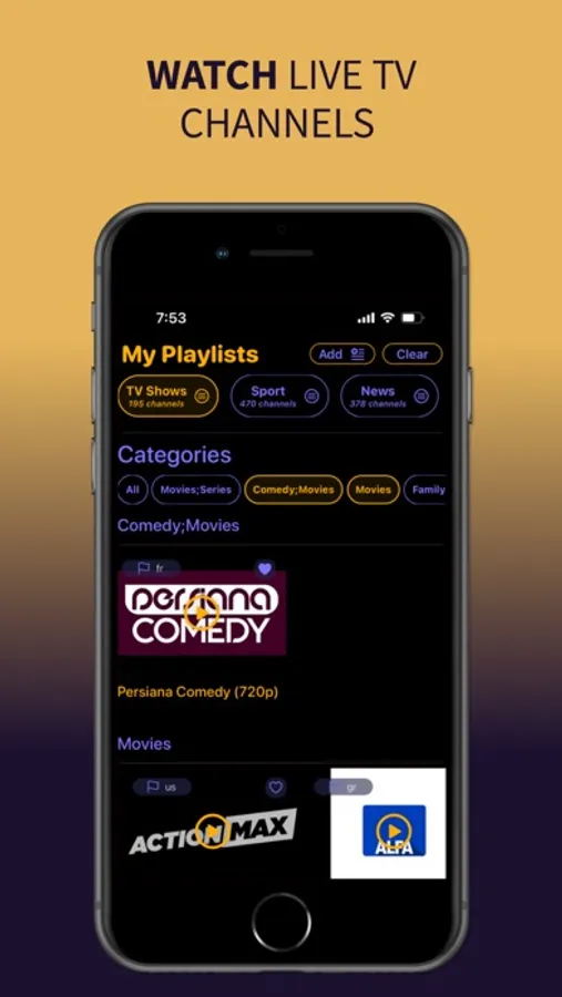 To get started, you will need to search for an IPTV Provider online, and use the .m3u URL to upload your playlist to the app. After that, all the magic happens, you are free to browse and favorite your preferred categories and channels, and watch them at anytime. With our Premium subscription you get to Stream your content to your TV through Apple's Airplay technology.