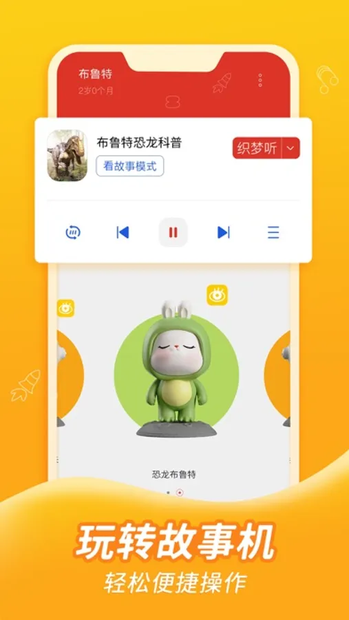织梦月球APP需搭配织梦月球智能投影故事机Z10进行操作使用,这是一台专为1-8岁孩子设计的智能早教设备,由故事机与公仔两部分组成,当将公仔放到故事机上时,可以以【投影】或【熏听】两种形式播放对应故事内容;并拥有天猫精灵、手机APP等智能操作体验,强化视听体验的趣味性及有效性,打造视听结合的投影故事机新品类。